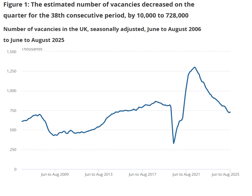 The estimated number of vacancies in the UK fell by 10,000 in the quarter, to 728,000 in June to August 2025