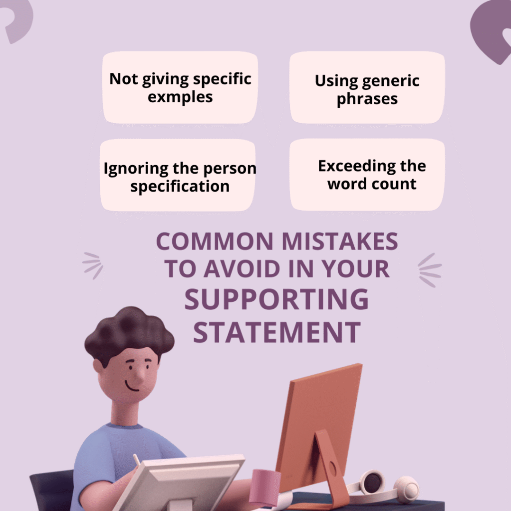 By understanding these mistakes, you can write a supporting statement that clearly shows your skills, proves your achievements, and grabs the recruiter’s attention.